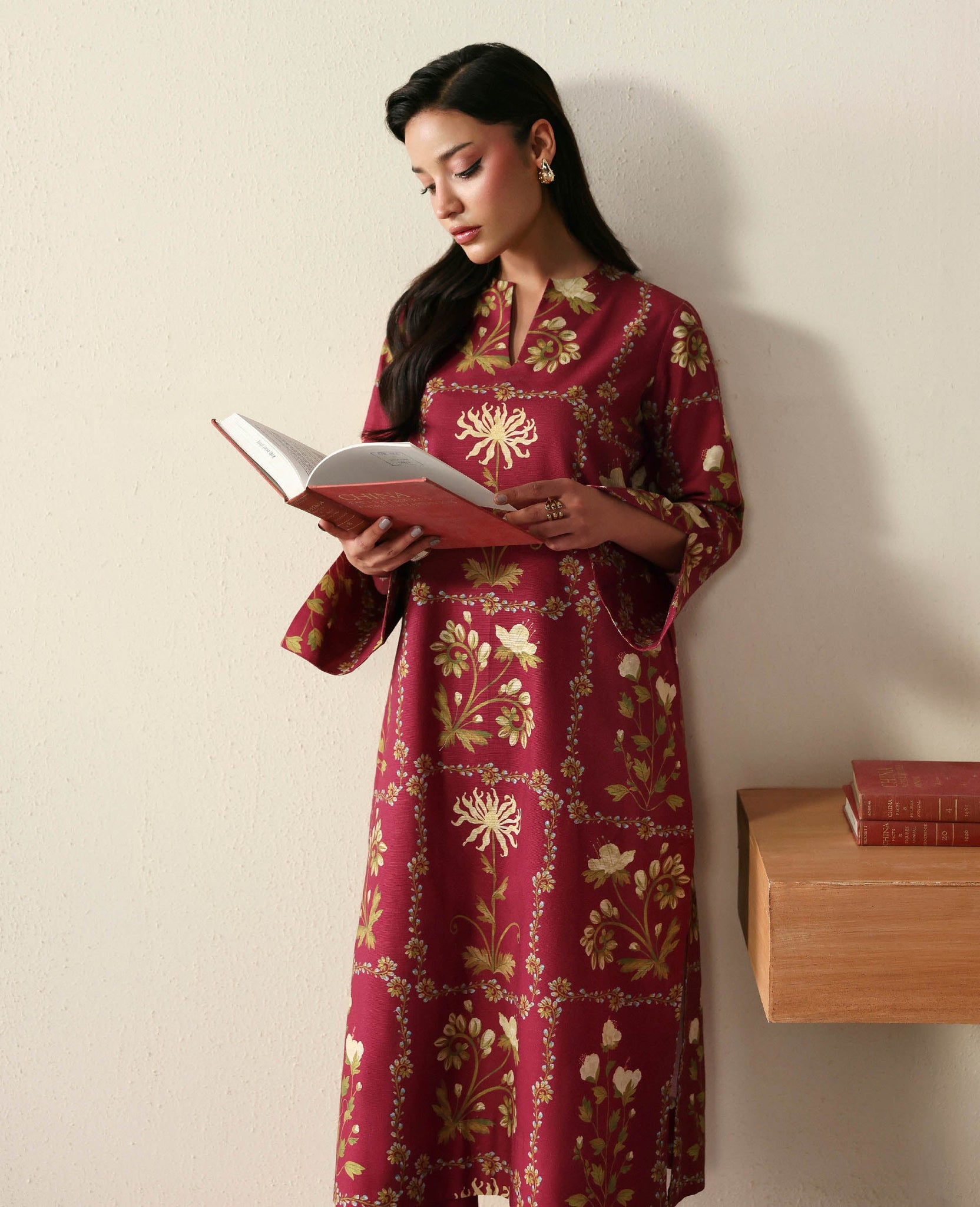 A maroon printed shirt with an all-over floral design, paired with matching maroon trousers featuring subtle beige and green floral prints. The harmonious blend of bold florals and minimalist accents creates a sophisticated, yet vibrant look.