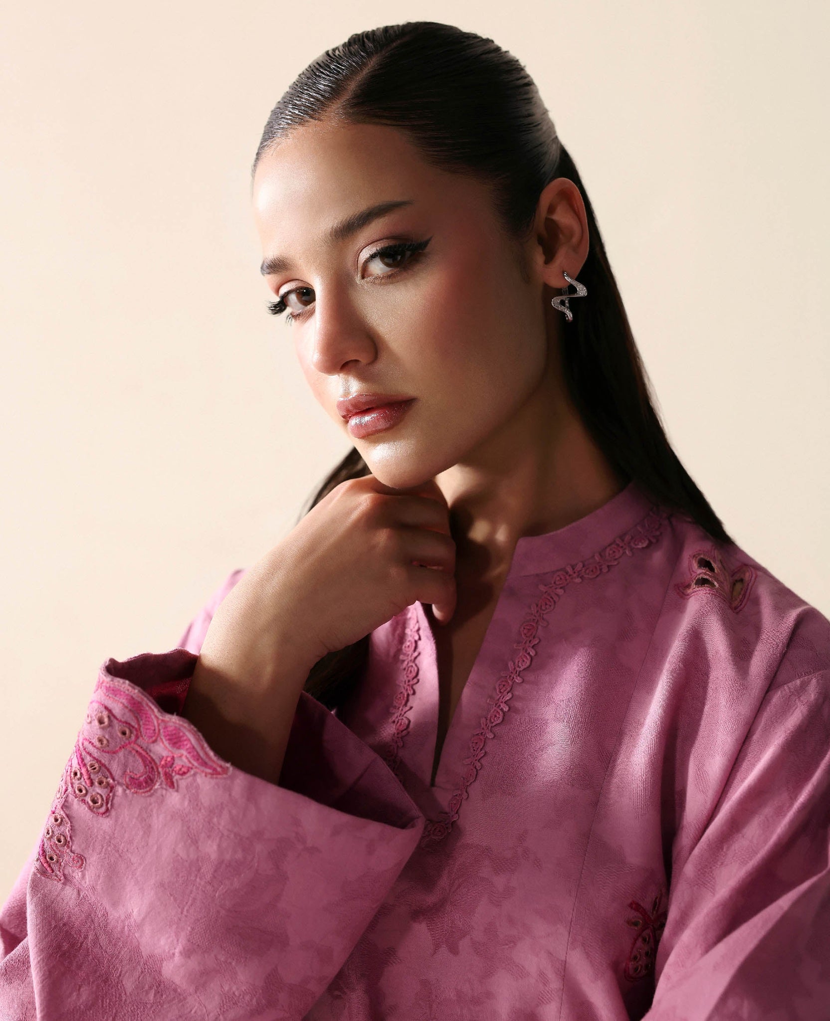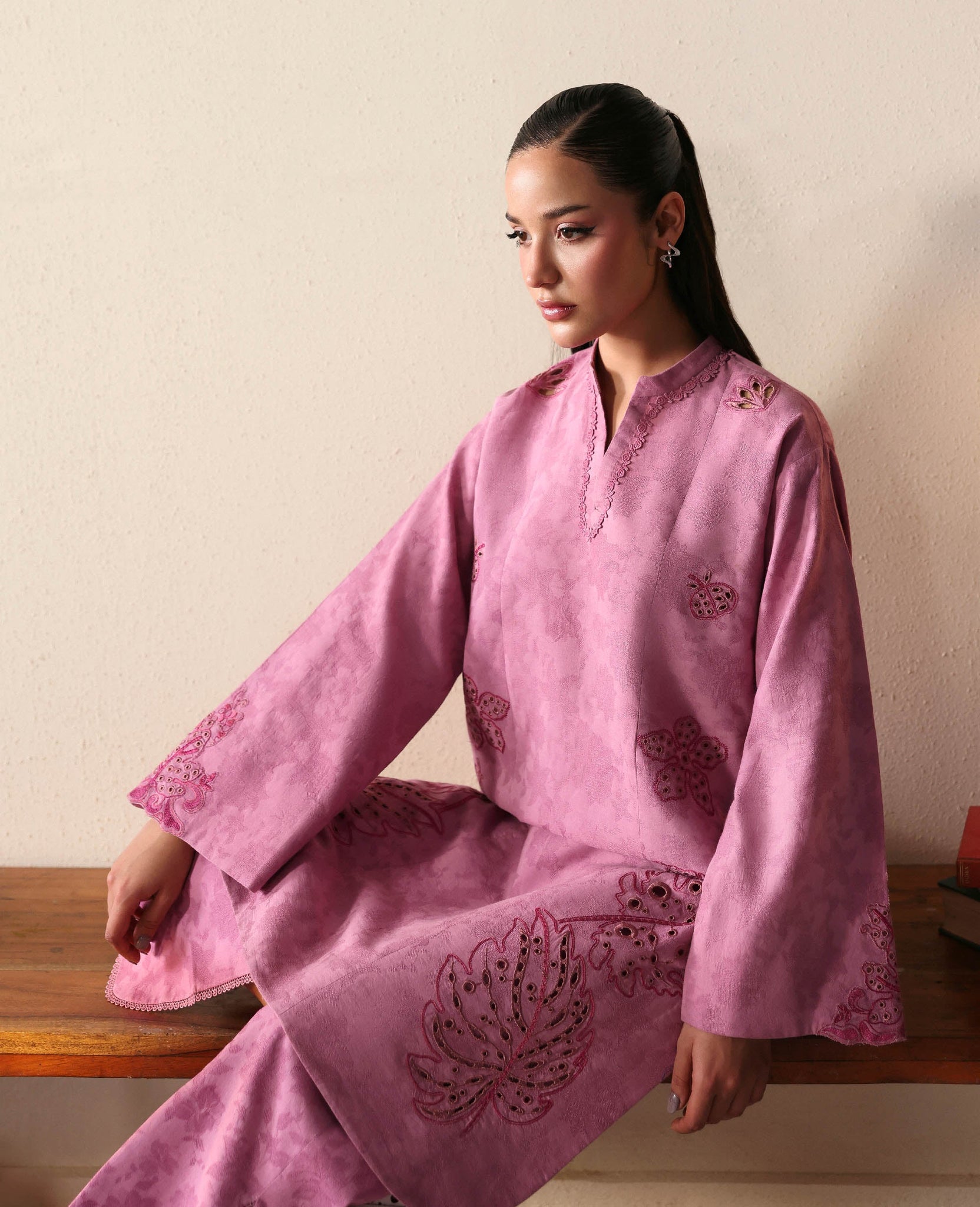 Includes: Shirt & TrouserA pink jacquard shirt with a short silhouette and a rounded hem, paired with matching jacquard trousers. The inner panels are embroidered with delicate leaves and florals, while cut-out details add a modern, feminine touch to the overall look.