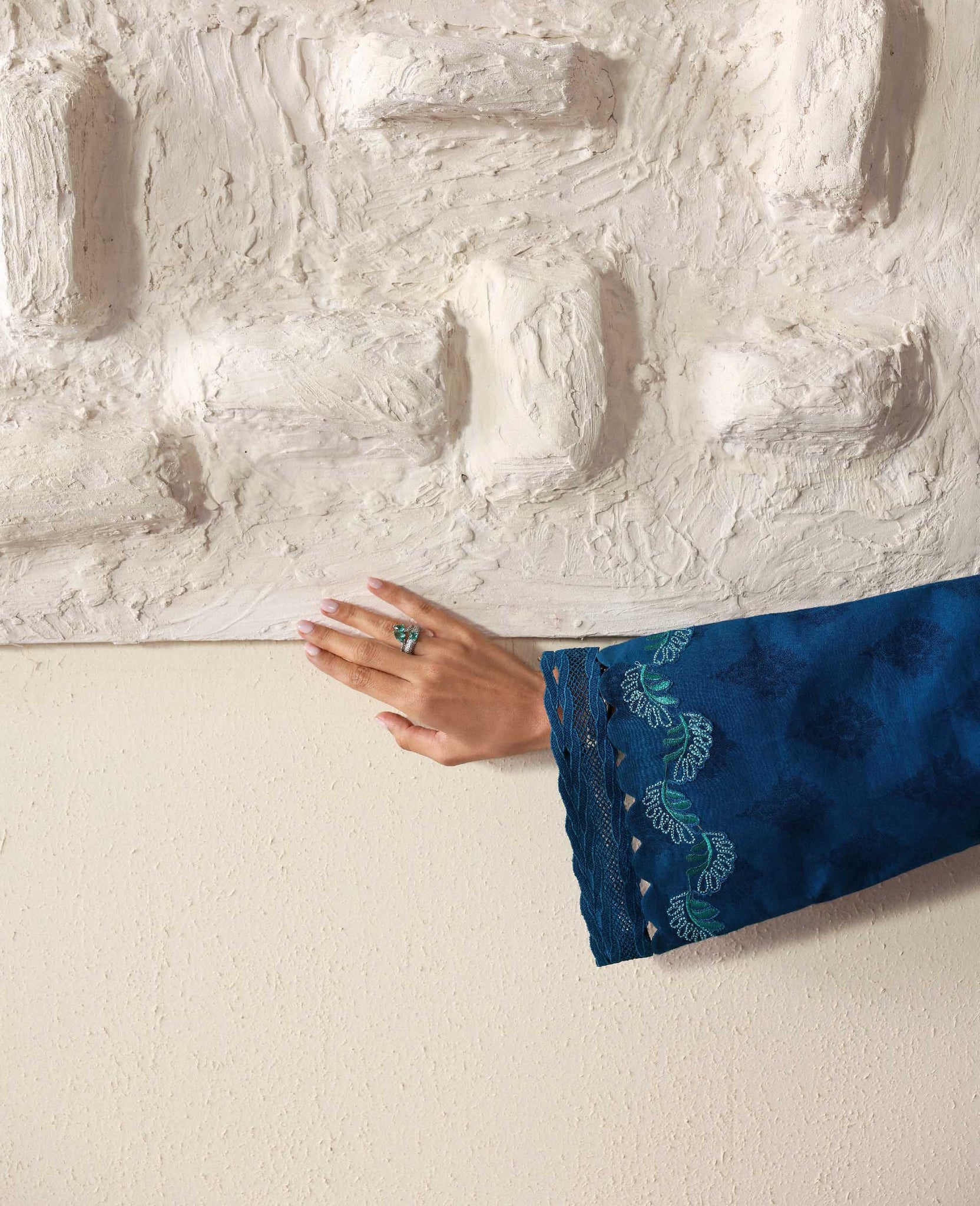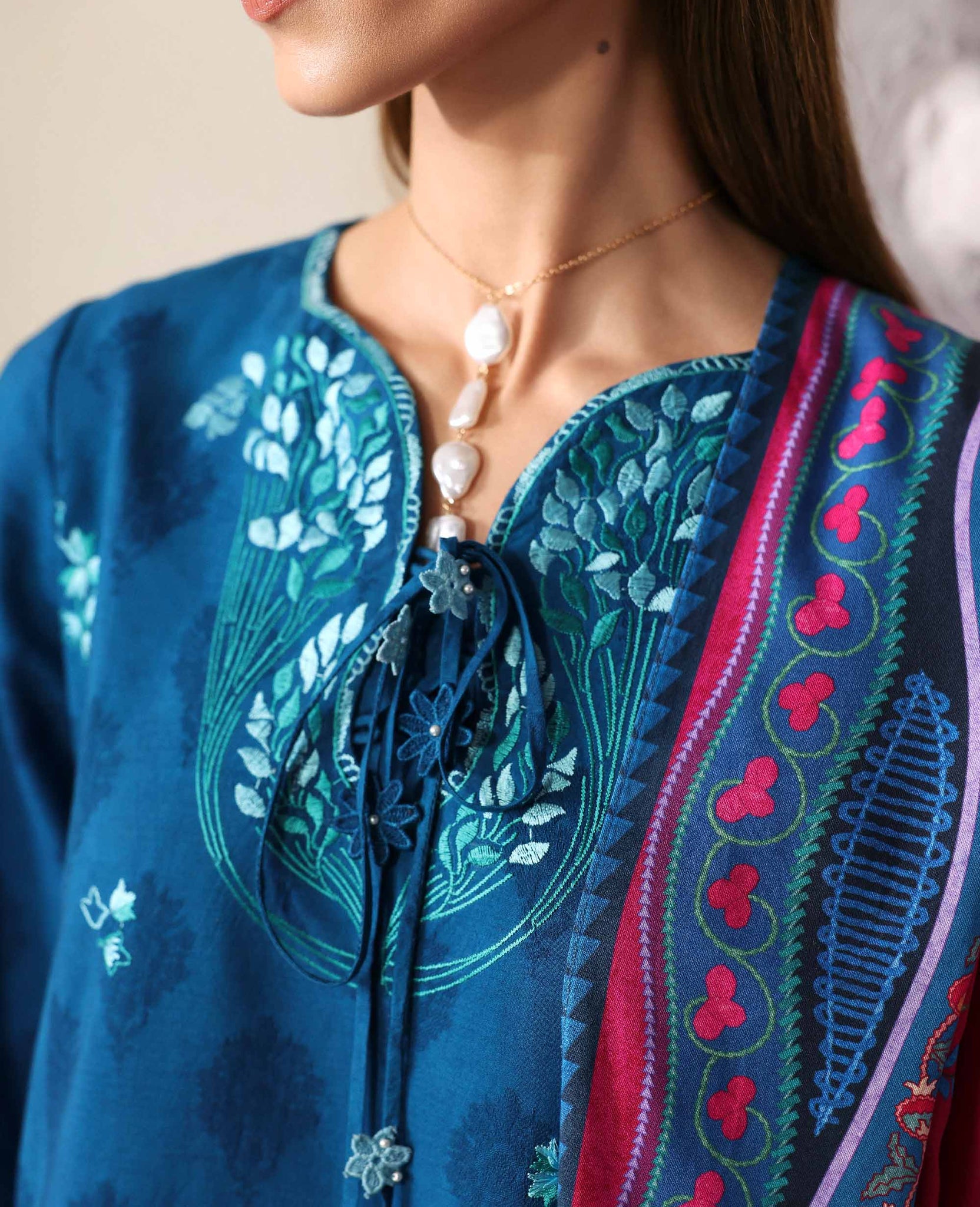 Includes: Shirt, Trouser & ShawlA symphony of sea-greens and blues flowing into a rich peacock hue, this three-panelled self-jacquard shirt is a vision of graceful transition. Delicate cutwork graces every panel, while the embroidered sleeves and coordinated trouser elevate the look with quiet sophistication. Paired with a vibrant, intricately printed Twill Marina shawl, the ensemble blooms with color, texture, and timeless allure.