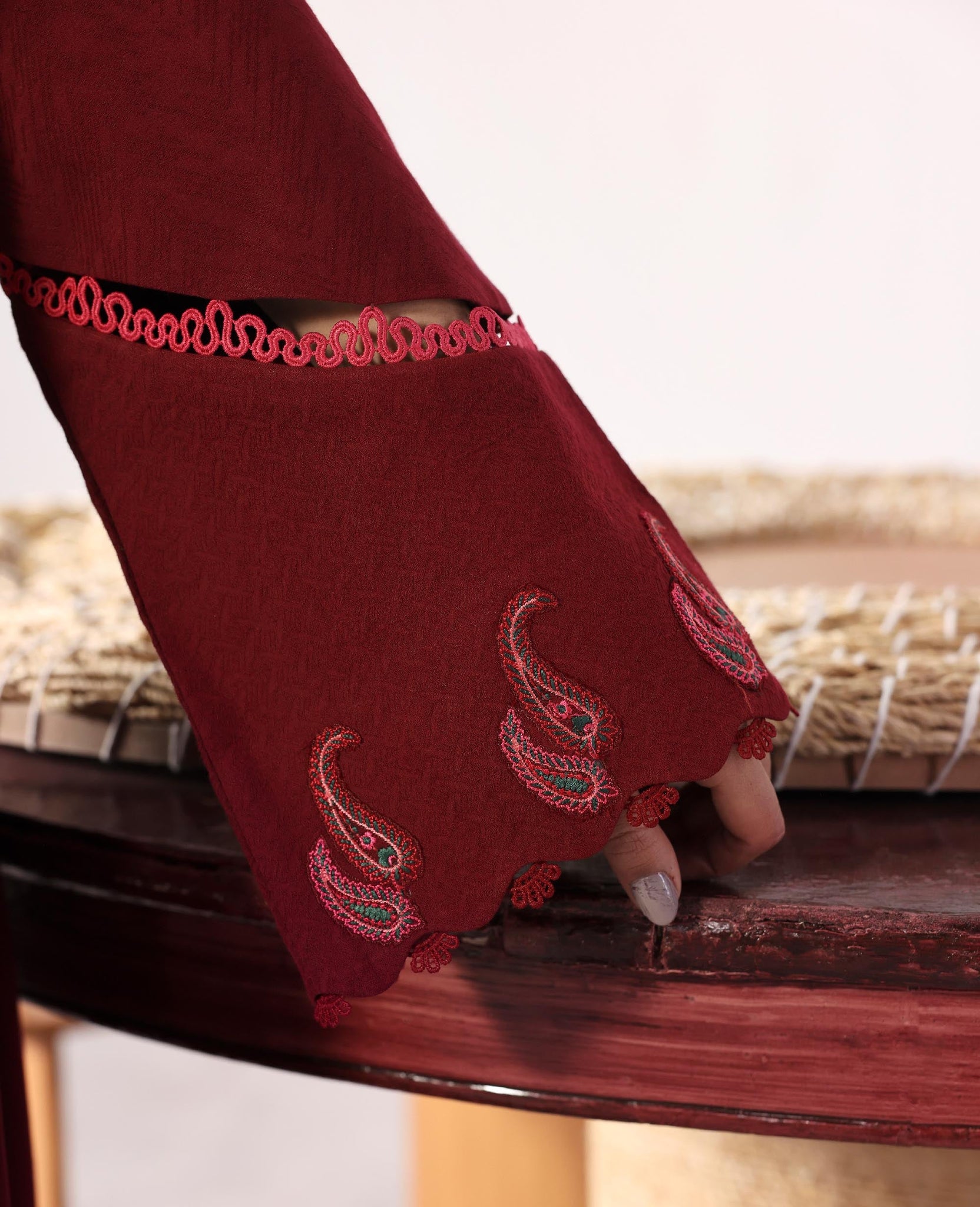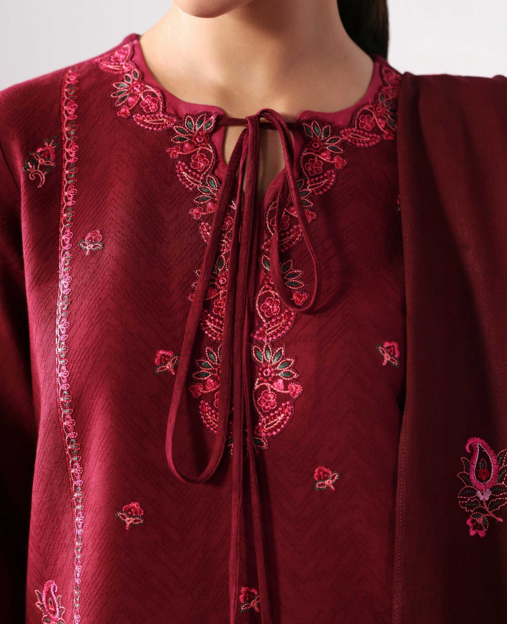 Includes: Shirt, Trouser & ShawlA maroon three-panel long shirt featuring Kashmiri-inspired neckline embroidery, fully embroidered front panels, paisley-detailed sleeves, and modern color-block edging. Paired with a coordinated embroidered twill marina shawl with color-block patches, and matching self-jacquard shirt and trousers for an elegant, cohesive look.