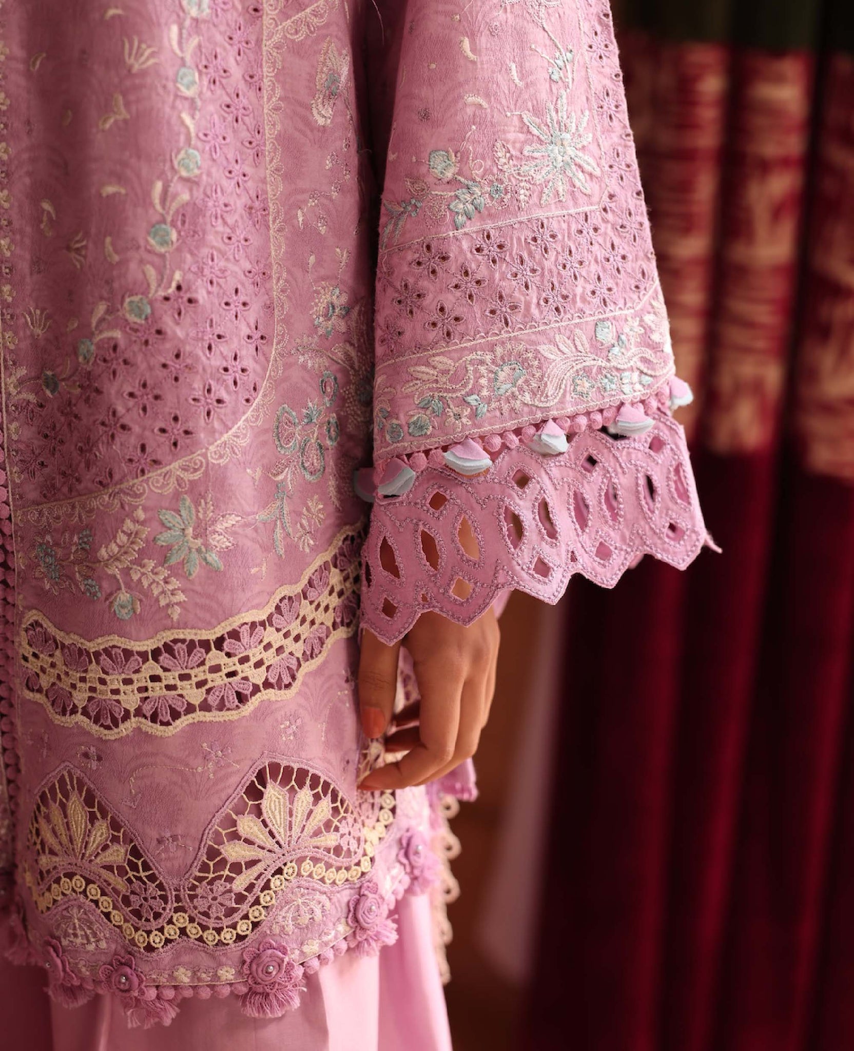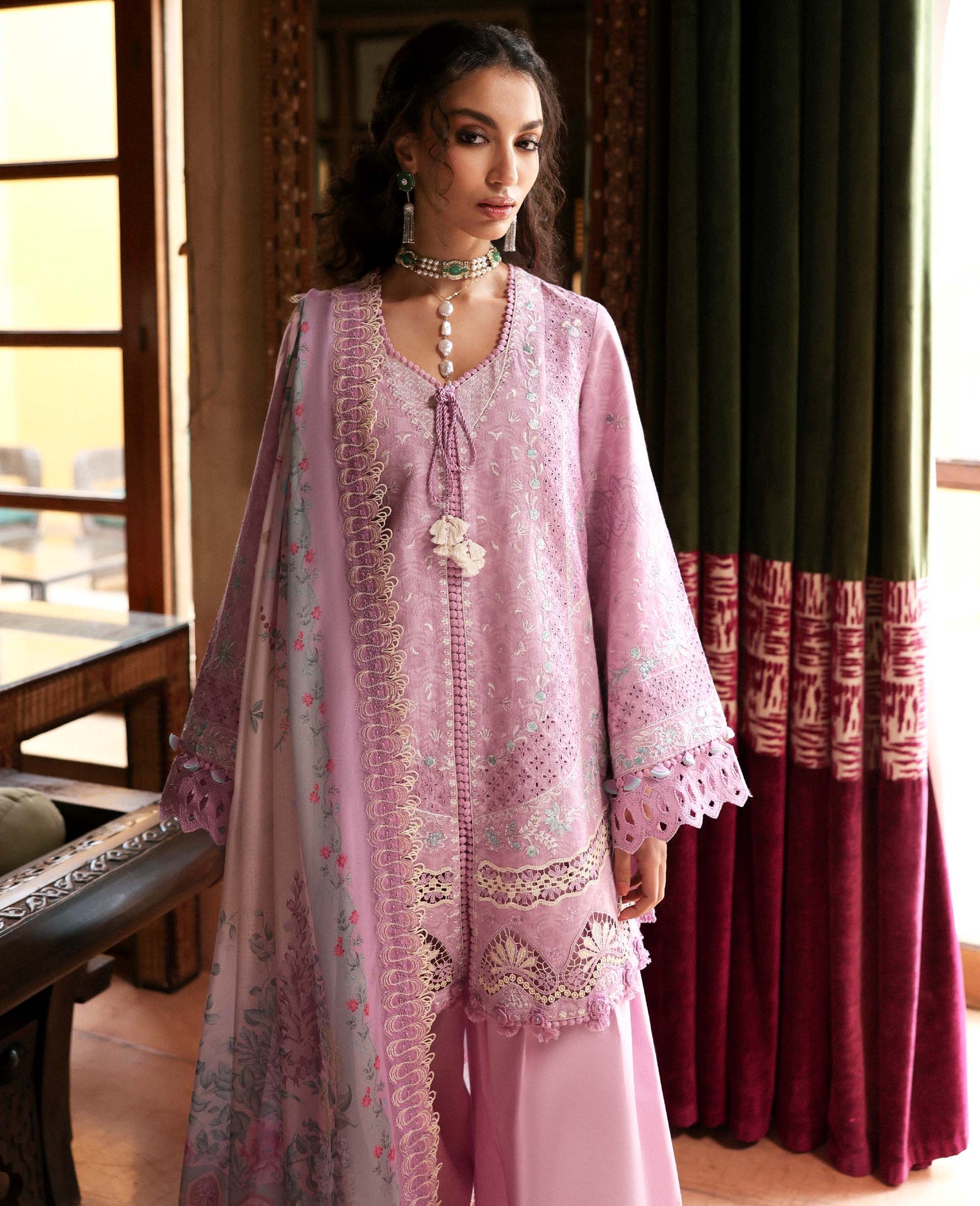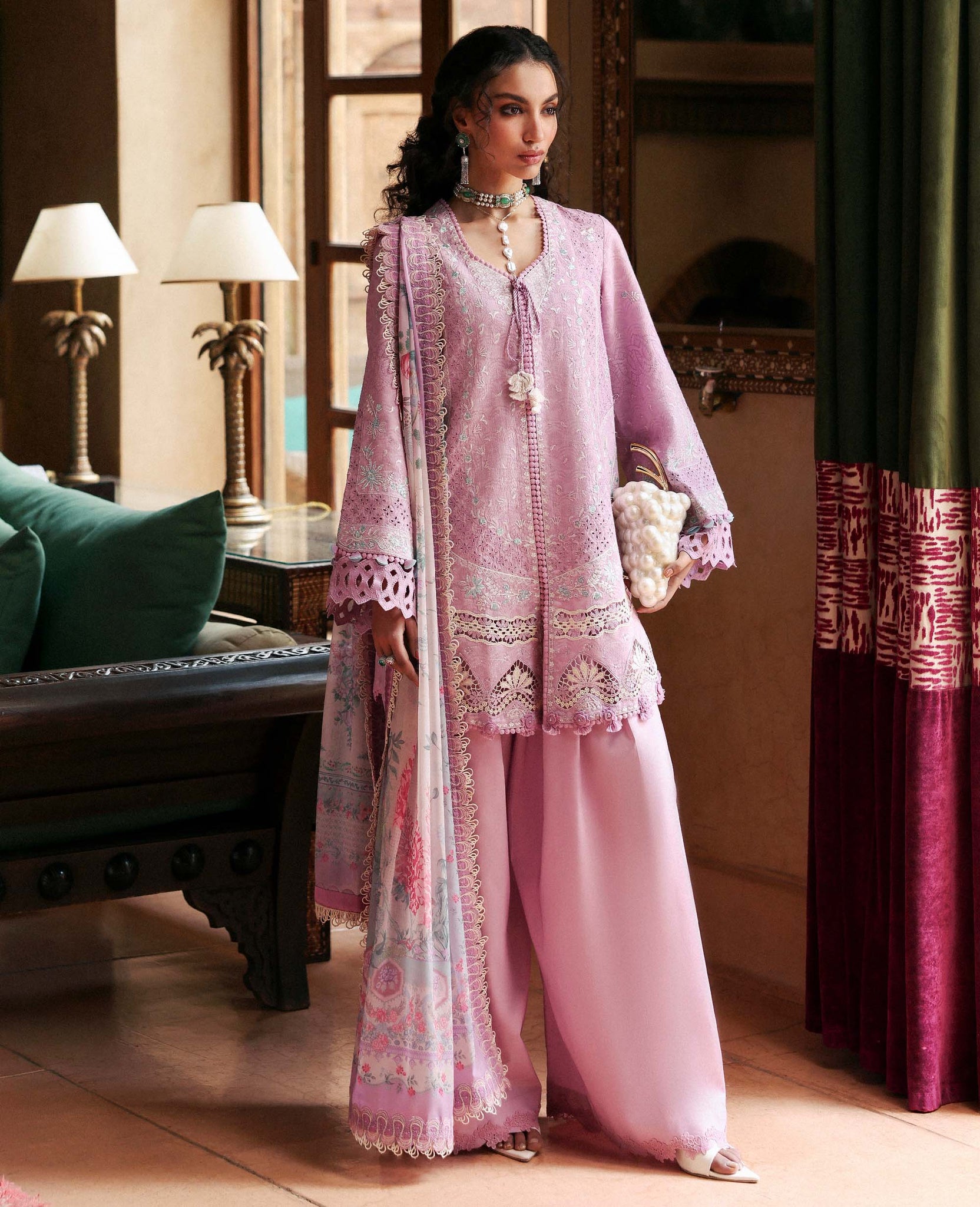 Includes: Shirt, Trouser & DupattaThis soft blush pink outfit features intricate embroidery with delicate lace detailing on the shirt and sleeves. Paired with wide-leg trousers and a beautifully printed silk dupatta, the look is feminine, graceful, and perfect for festive or semi-formal occasions.