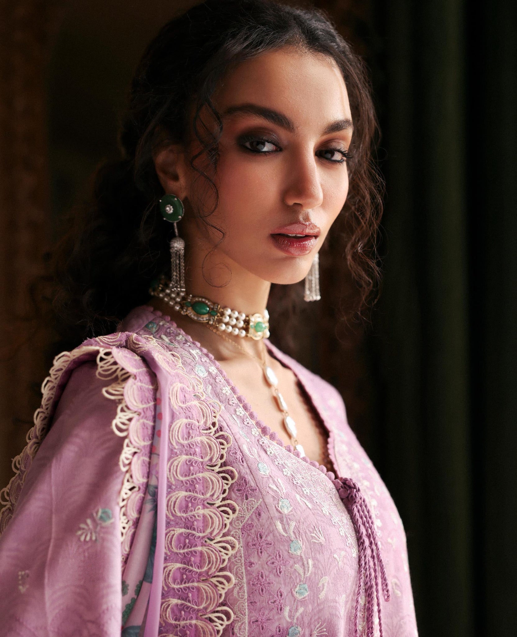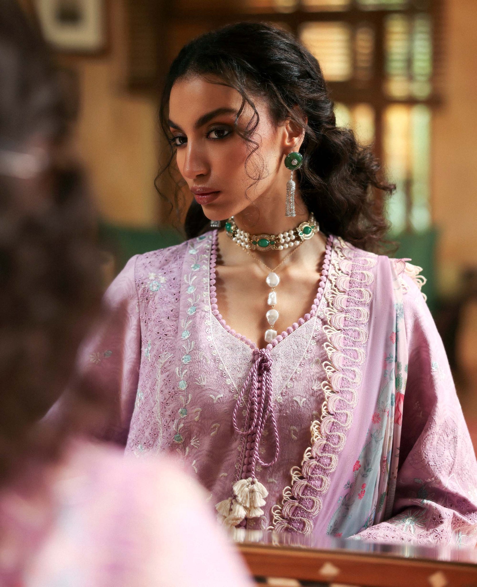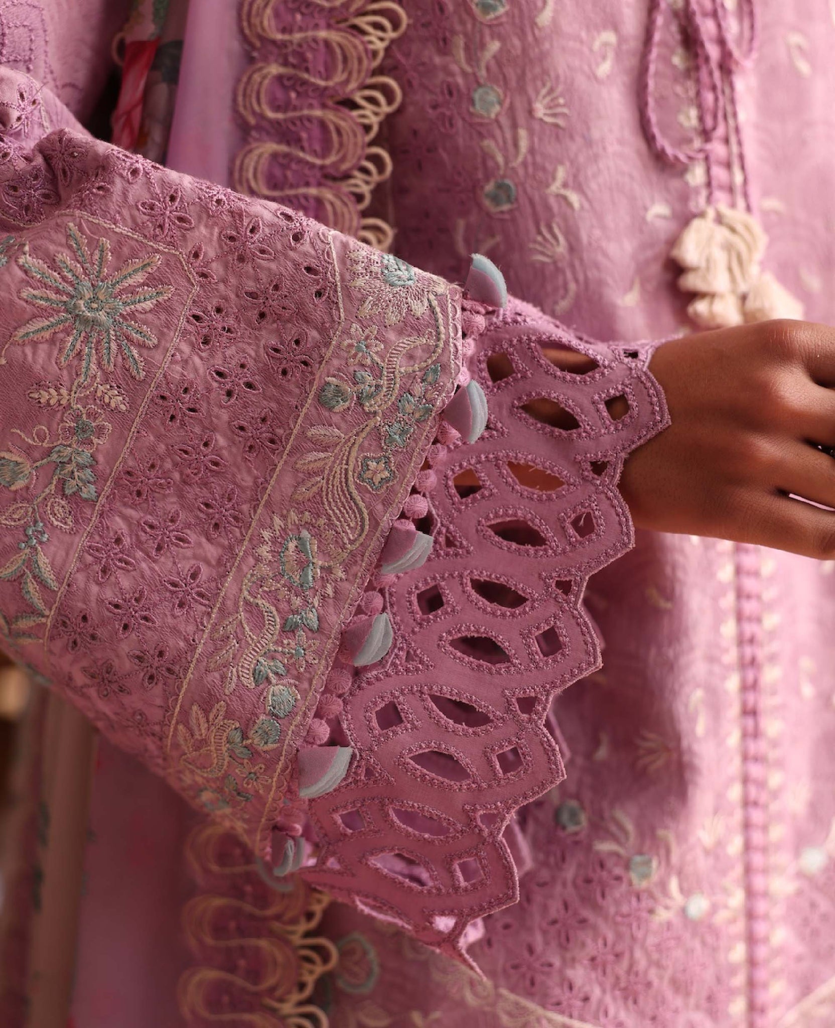 Includes: Shirt, Trouser & DupattaThis soft blush pink outfit features intricate embroidery with delicate lace detailing on the shirt and sleeves. Paired with wide-leg trousers and a beautifully printed silk dupatta, the look is feminine, graceful, and perfect for festive or semi-formal occasions.