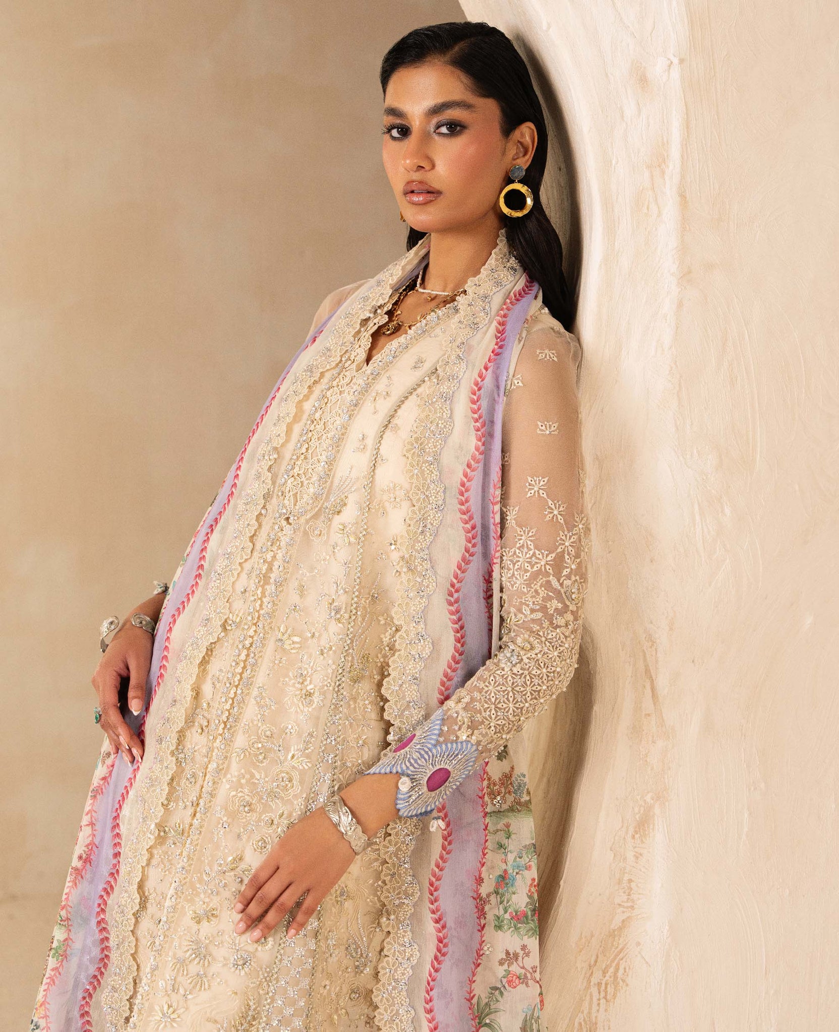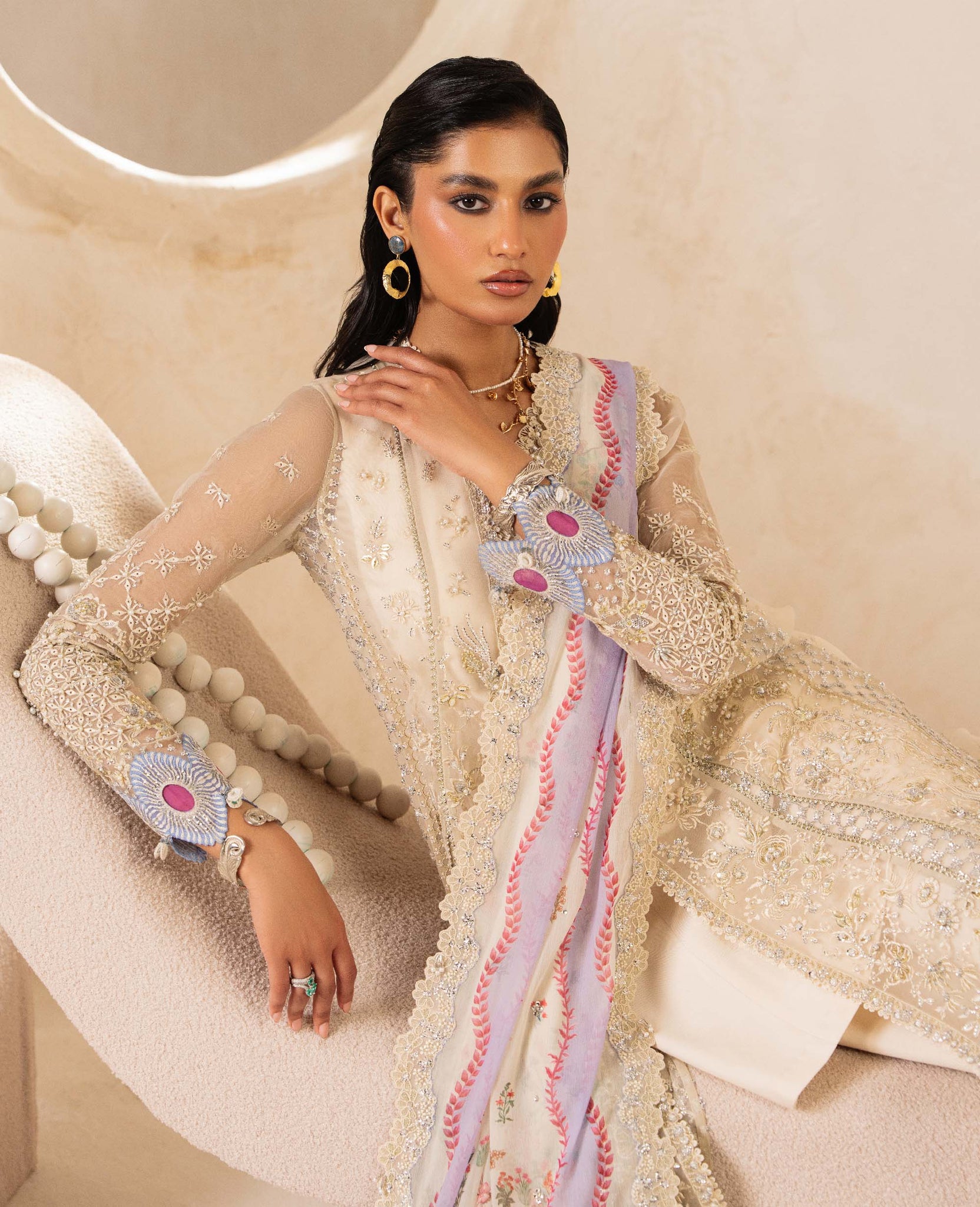 This ensemble is a graceful fusion of traditional opulence and modern sophistication, presented in a soft, regal color palette. The statement piece is a long, straight, front-open shirt in a warm ivory tone, lavishly adorned with intricate embroidery, sequins, and delicate beadwork. Crafted in sheer organza layered over a solid inner, it offers dimension and elegance without feeling heavy. The hemline is highlighted with contrasting pastel blue and lilac embroidered borders, finished with subtle tassel-inspired detailing that adds charm and movement. It is paired with a printed chiffon dupatta and wide-leg, structured ivory trousers for a balanced and refined silhouette.