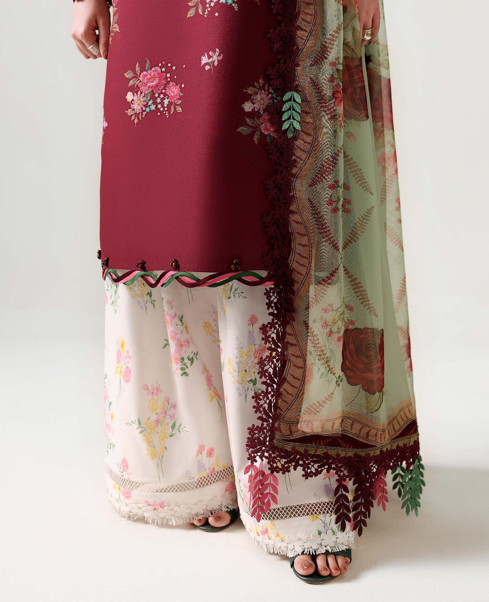 Deep red printed lawn unstitched outfit paired with a floral chiffon dupatta and white contrast shalwar. Subtle embroidery on the neckline and sleeves perfect for everyday comfort with a touch of grace.