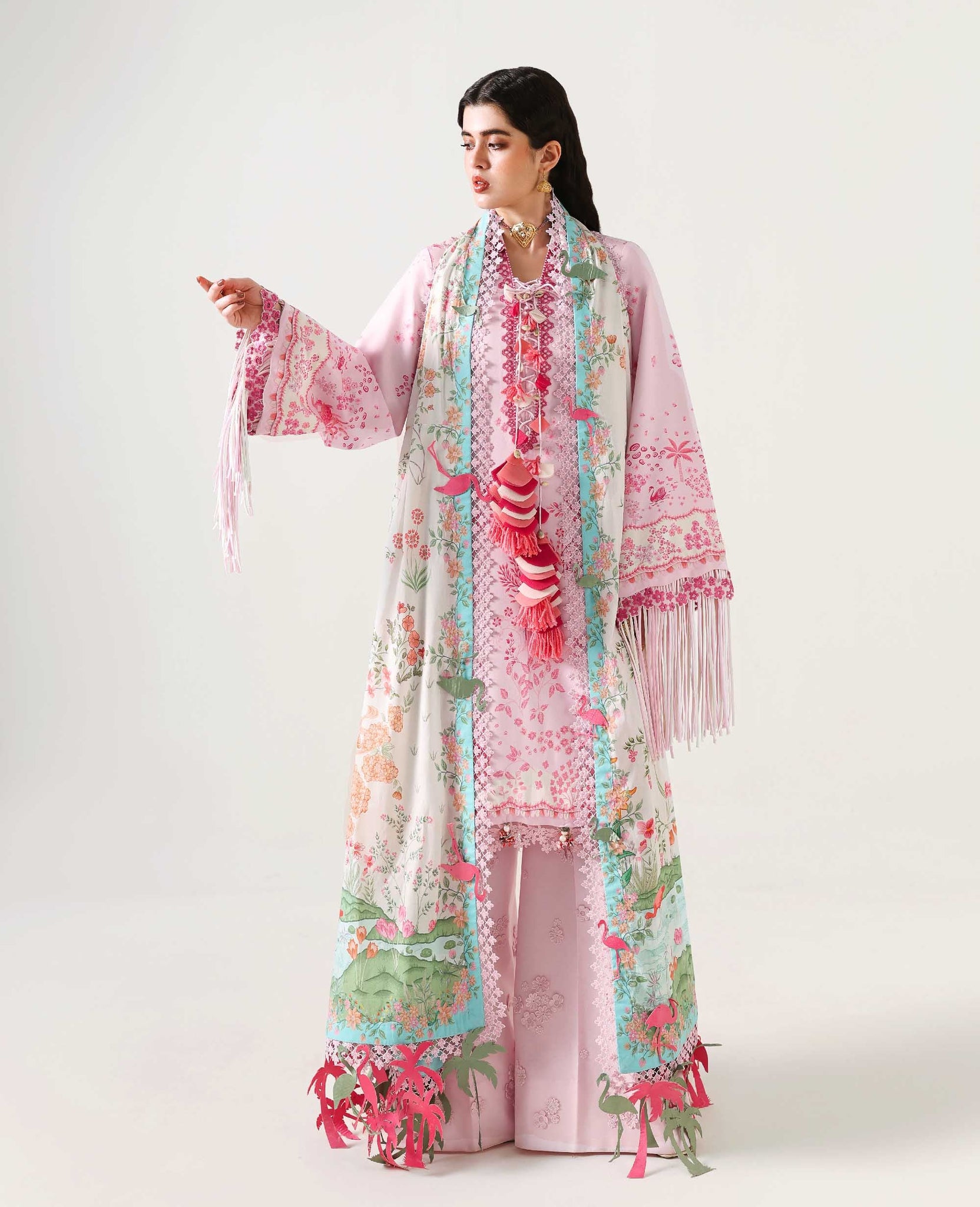 Pastel pink printed lawn unstitched outfit paired with a serene scenic voile dupatta. Delicate embroidery on the neckline and sleeves adds a graceful finish perfect for light, everyday wear.