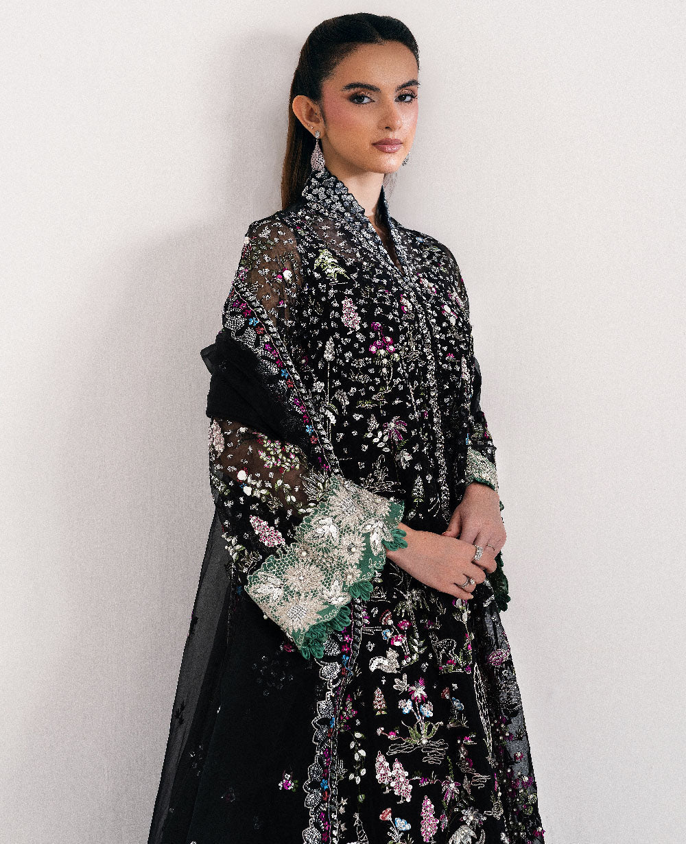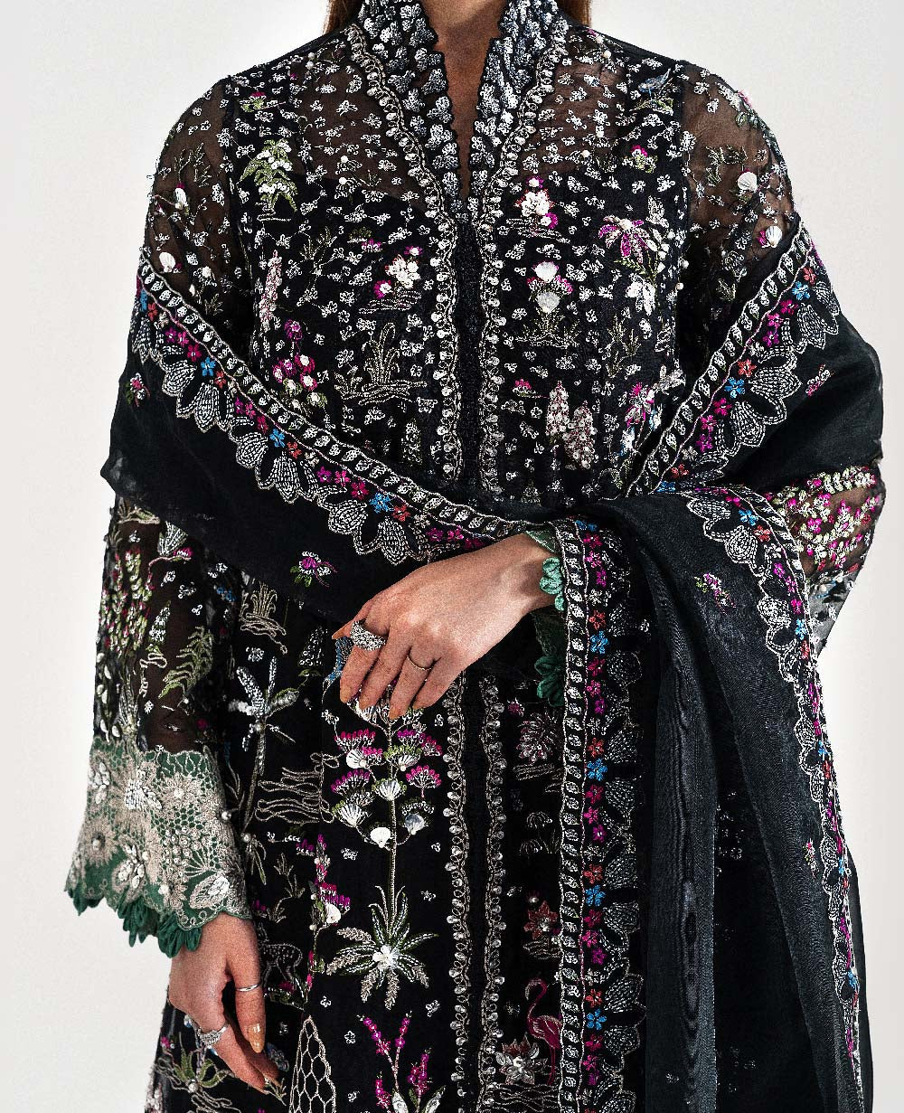 Includes: Shirt, Lehenga, Slip & DupattaA black, six-paneled organza shirt adorned with intricate shikargah motifs intertwined with delicate florals cascading across the panels. Serene blue arches complement two hem borders in green and hot pink, finished beautifully with lace. The shirt features a sequin collar, while the sleeves are richly decorated with sequins and floral embroidery, highlighted by a green border and looped detailing at the cuffs. The organza dupatta showcases a sequin spray at the center, framed by a four-sided floral border. Completing the ensemble are black raw silk lehnga trimmed with gotta borders at the hem.