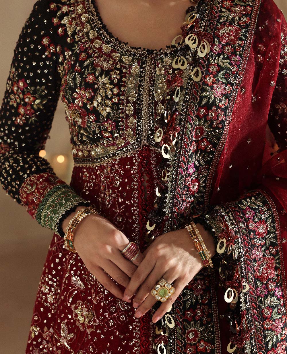 A symphony of bold elegance and timeless craft this organza paneled masterpiece enchants with its striking contrasts. The structured black bodice blooms with vibrant, hand embroidered florals melting seamlessly into rich red organza panels adorned with silver motifs and sequins that glimmer like stardust. Lush green and hot pink borders frame the design with playful sophistication, while the organza dupatta softly shimmering with scattered sequins adds a veil of mystery. Finished with a black embroidered border, it becomes a portrait of refinement, artistry and allure. A true celebration of modern glamour rooted in heritage.